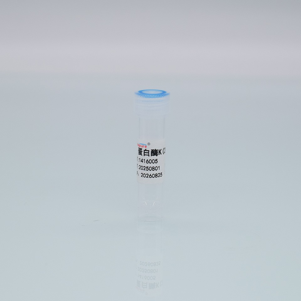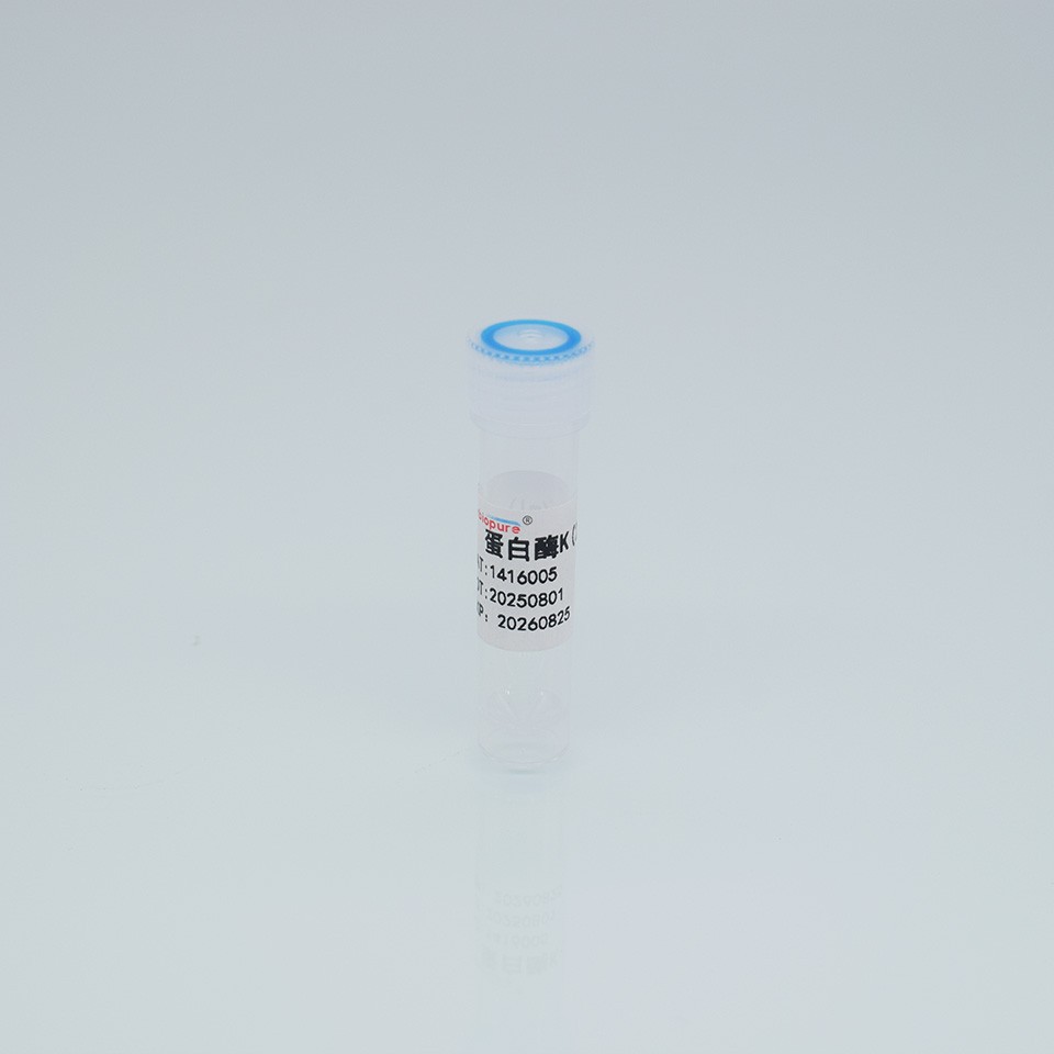 蛋白酶K(Proteinase K),相對分子量約為29.3 kDa, 是一種切割活性較廣的絲氨酸蛋白酶。可切割脂族氨基酸和芳香族氨基酸的羧基端肽鍵,應用廣泛,可用于制備脈沖電泳的染色體DNA,蛋白質(zhì)印跡以及去除DNA和RNA制備中的核酸酶等實驗,蛋白酶K的一般工作濃度是50—100μg /ml。因蛋白酶K在變性劑如SDS(1%)中可提高其活性,所以在使用中,常根據(jù)所用緩沖液是否含有SDS、尿素、pH、溫度等因素確定具體的工作濃度。蛋白酶K在較廣的pH范圍內(nèi)(pH 4-12.5)均有活性。